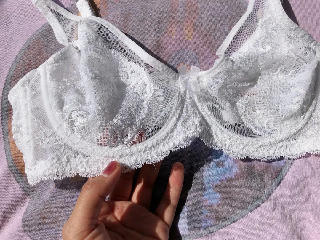 其实这款内衣是专为大胸女孩设计的,因为它主打的就是“大胸显小”功能。这款也是HSIA遐的爆款内衣,销量第一,有70w+的plmm都买过这件。但是桃子一个75B女孩来这儿凑什么热闹,因为它实在太太太太美了啊,真的是穿上去令人一眼惊艳的那种,并且超级舒适~桃子刚收到这件内衣的时候,还在疑惑“这么透,穿上去会不会露点,会不会很色情?”直到穿上去,桃子只想说“真香”。它是那种非常轻薄的全罩杯设计,轻薄到什么地步呢?就只有一层蕾丝+轻薄底网,整个内衣都是一体白色。穿上去乳晕的地方恰好被蕾丝花纹挡住,胸部若有似无地被包裹在其中,自己看着都觉得太撩了~但因为纯白极简设计,且小点点都被遮住了,所以完全没有色情感,反而又纯又欲,高级地情趣着。这款内衣也是双U型设计,承托和聚拢效果非常好。又因为极其轻薄,所以穿上真的毫无束缚感。桃子觉得这款内衣设计得太有情趣感了,所以不仅可以日常穿,也很适合和男朋友约会调情穿~
