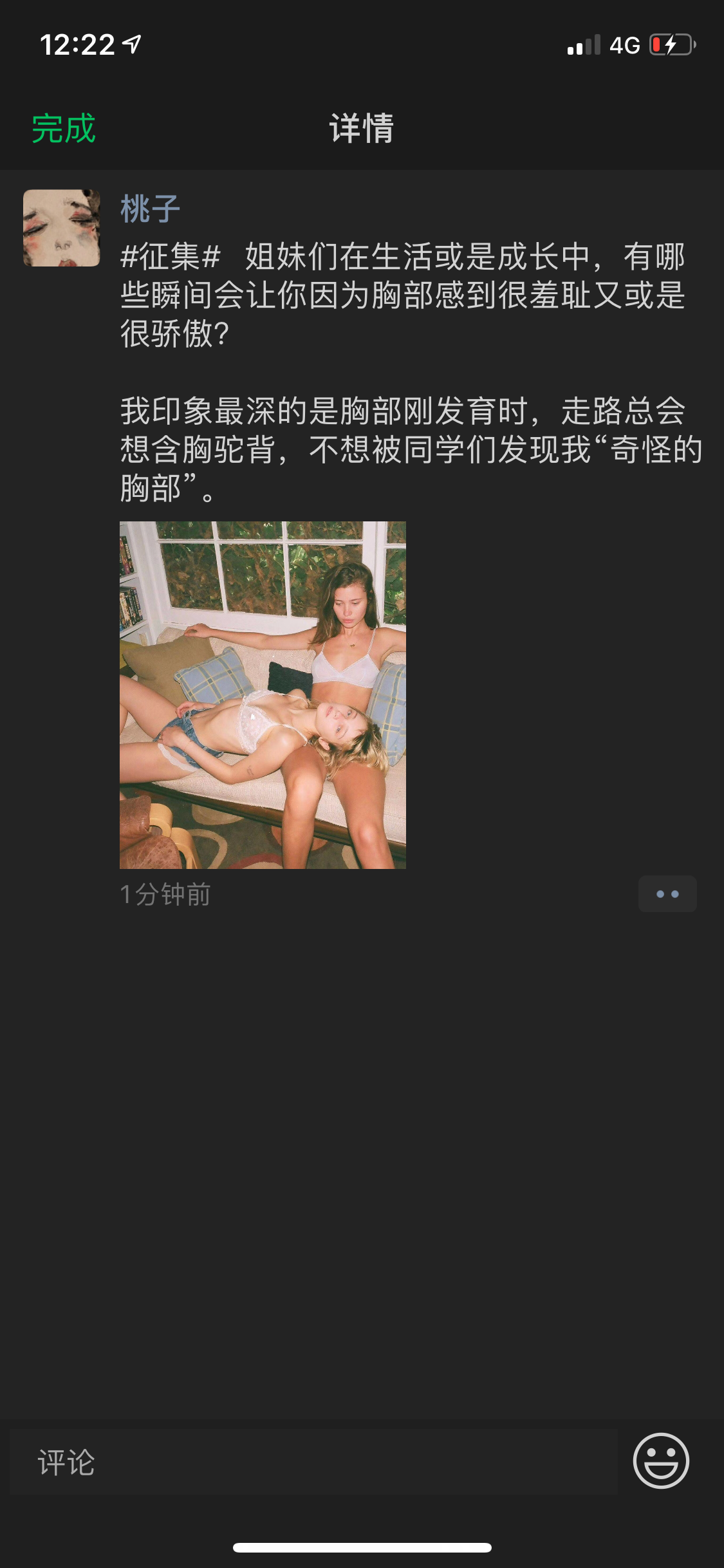 而这些关于胸的困惑,并不是少数女孩才有的,大部分女孩都会有。比如桃子身边的女性朋友,胸大的会觉得自己胸太大了,胸小的又会为自己的“小”而自卑,甚至没有一个女孩敢大声地说“我很喜欢我的胸”。所以桃子想要更多地了解姑娘们和自己乳房的故事,也许从这些真实个例中可以解惑——“到底什么才是美胸?”“姑娘们怎样才能爱上自己的胸?”@芭芭拉:我们家的家风一直都是非常传统的那种,尽管我都22岁了,但是我妈还是会非常严格地管理我的穿着,最喜欢让我穿运动衣之类的。以至于我在学校自己去买衣服也习惯了很保守的那种,一穿显胸的衣服我就感觉很不自在,不自觉地含胸驼背,并且觉得周围人都在看我。从来没为自己的胸部感到骄傲或者开心过吧...@Eve:我的胸接近飞机场那种,就是平时穿衣服经常不需要穿内衣那种...室友们至少也都是B杯,穿小裙子都很好看,也更受男生喜欢,只有我胸部平得毫无性感可言。虽然平时经常会大大咧咧地跟她们一起开玩笑说自己的“一胸平川”,但心里还是多少挺自卑的。@雪见:我应该是传说中的D杯大胸,但是我一点都不喜欢我的胸。上小学时我就比同龄女生发育的早,那个时候觉得自己像个异类,总是喜欢很宽大的衣服遮住自己。一直到长大,也一直都不喜欢自己的胸,受够了男生戏虐的眼神,也不喜欢大胸穿衣服的感觉,觉得自己穿什么都没有少女感,买内衣更是很挑只能买完全没海绵垫的那种...@都一样:之前没观察过自己的胸部,直到上大学以后住集体宿舍,室友们一起去公共澡堂洗澡也会讨论彼此的胸。对于我的胸,我们得出一直结论,那就是虽然码数不小,但是外扩严重不聚拢,所以不如另一个室友的A杯胸好看。@高高:我觉得自己的胸适合穿着内衣看,脱了内衣就觉得很奇怪,因为乳晕太大了。我之前试过很多乳晕颜色变浅的方法,但都没什么卵用...@人鱼怪:我的胸属于不大也不小的那种,也算比较挺拔,穿什么衣服都可以~我自己在家很喜欢穿v领小吊带,但是我却从来不敢穿出门。因为害怕被人认为我很风骚,所以也只敢自己在家独自美丽哈哈哈哈。@菲菲:真的很讨厌夏天,夏天就意味着必须得穿内衣了。但是胸上罩着一个紧紧的东西,真的很不舒服。每次回到家的第一件事,就是先把内衣脱了,这个时候才觉得自己活了过来。并且很多内衣对胸部很束缚,穿久了其实很容易导致女性乳腺增生等。我真的很希望,有一天可以不穿内衣。