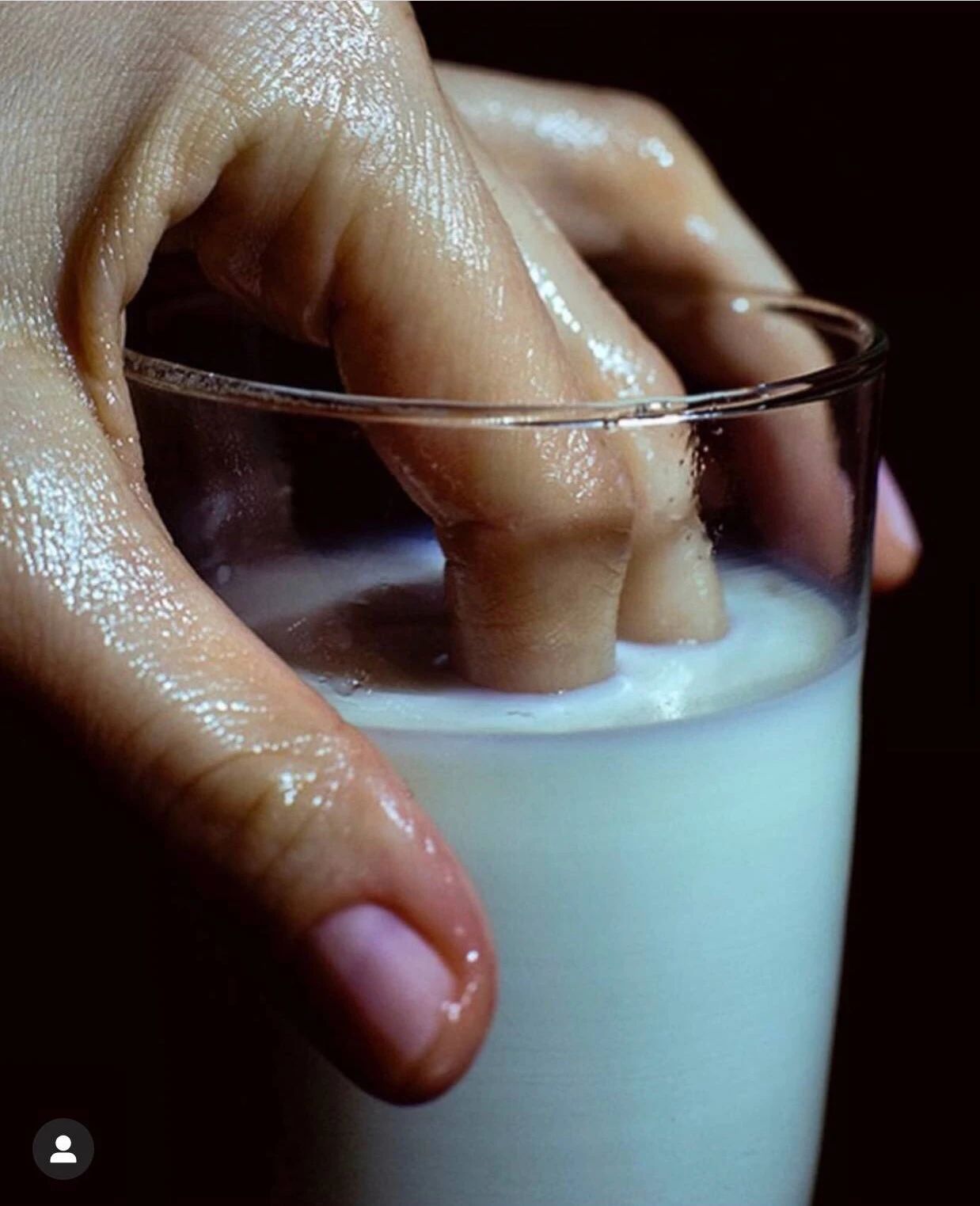 我原本以为“牛奶”这个意象只有在被喝掉的时候才充满性吸引力,但其实,单单只是玻璃杯中的牛奶,就可以表达出不少暗示的意味。湿漉漉的手指,在黑色背景下显得那么突兀,完全不同于水果摄影的色彩之浓烈。 ?