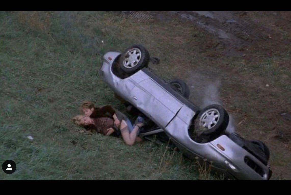 还有这个,桃子最喜欢的一张。哪怕发生了意外,车都倾倒了,我还是要和你调情。或者说,本来就是在和你调情的过程中太过激动,一时没控制好自己,车才侧翻了的。(千万不要模仿这个动作哦)