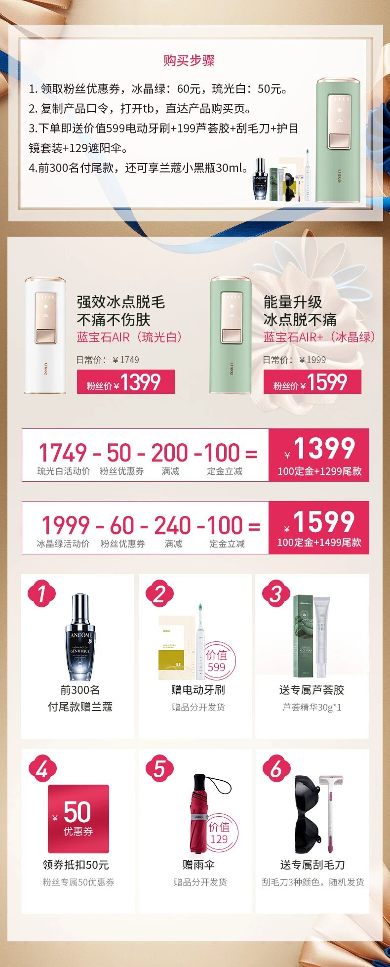 而Ulike蓝宝石脱毛仪呢?单价看起来很高,要1999元。但是相比之下,其实性价比非常之高,并且相当于“永久脱毛”+“永久美白嫩肤”啊。