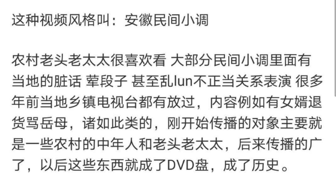 经过调查发现,这类画质粗糙,拍摄手法单一,镜头衔接粗暴,服化道质朴乡土,剧本乱伦奇葩,演技只比路人多5毛,但却有种迷之魔力让观者一边直呼辣眼睛一边欲罢不能的剧情小短片,叫做——安徽民间小调。