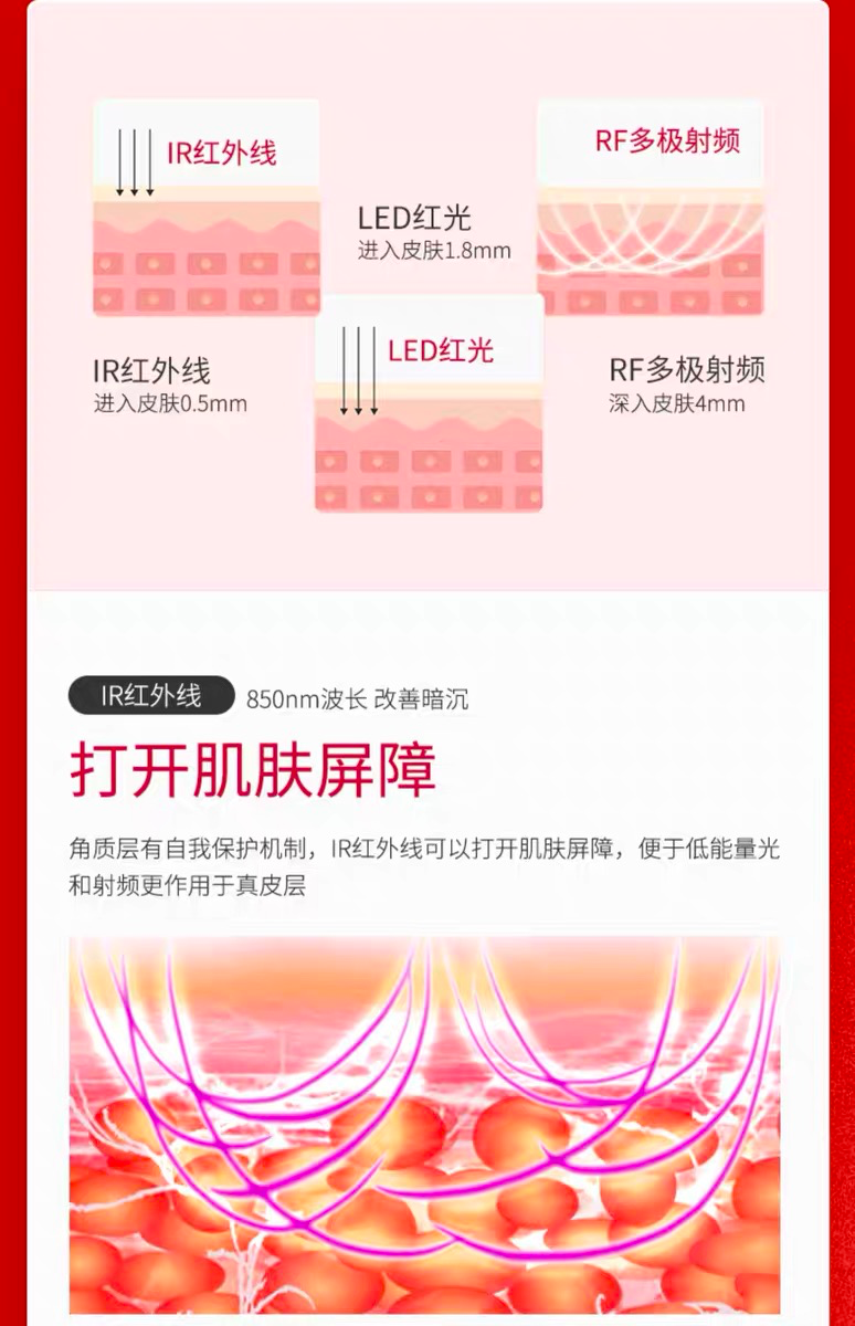IR红外线打头阵,它先深入皮肤0.5mm,打开皮肤屏障;继而LED红光上线,它深入到皮肤1.8mm的真皮层,刺激中层胶原蛋白增生;最后多极射频再发力,深入皮肤4mm穿透至真皮,刺激底层肌肤胶原蛋白再生。