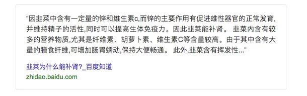 果然世间万物只有两种,一种是不可吃的,另一种是可吃的。如果说各地吃生殖器的习惯是源于“吃哪补哪” 的民间玄学。那么其他那些被认为可以滋阴补阳的食物呢?韭菜,民间绰号为“壮阳草”。烤韭菜在烧烤摊上是和烤羊腰一样的头牌。百度是如此解释它的功效的:但其实韭菜中所含的物质和提升性功能没有半毛钱关系,如果非要有,那可能就是其中所含的锌,锌有促进生产精子的功效,但是韭菜中的锌含量其实还不如香菇高。而且就平时吃的那点韭菜,真的不足以对精子有什么影响,更别提提升性功能了。