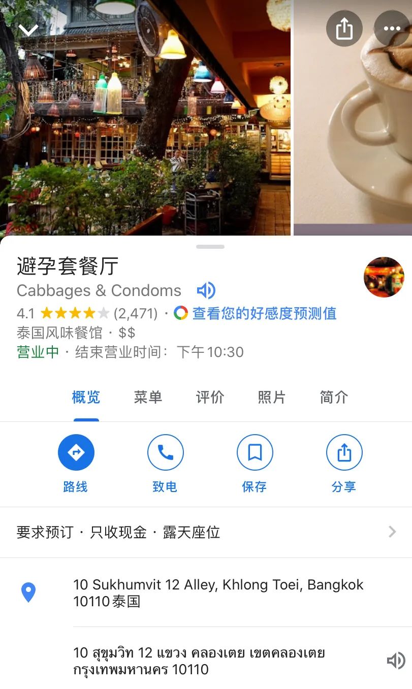 曼谷的夏日是湿热的,终于将行李成功安置在airbnb的我是躁动的。疲惫与饥饿交加,即使是探索欲极强的我也只得搜索最近的餐厅,随意对付一顿晚饭。但惊喜总是不期而至,就在离住处100米不到的地方,我找到了一家叫做Cabbages & Condoms的餐厅。