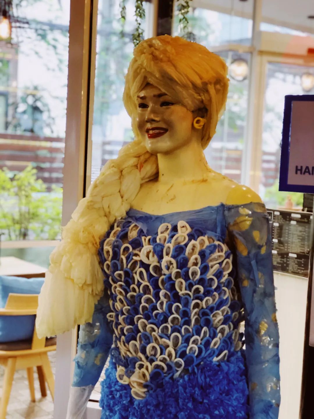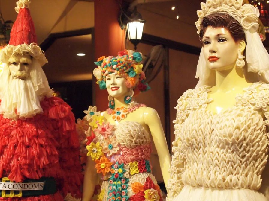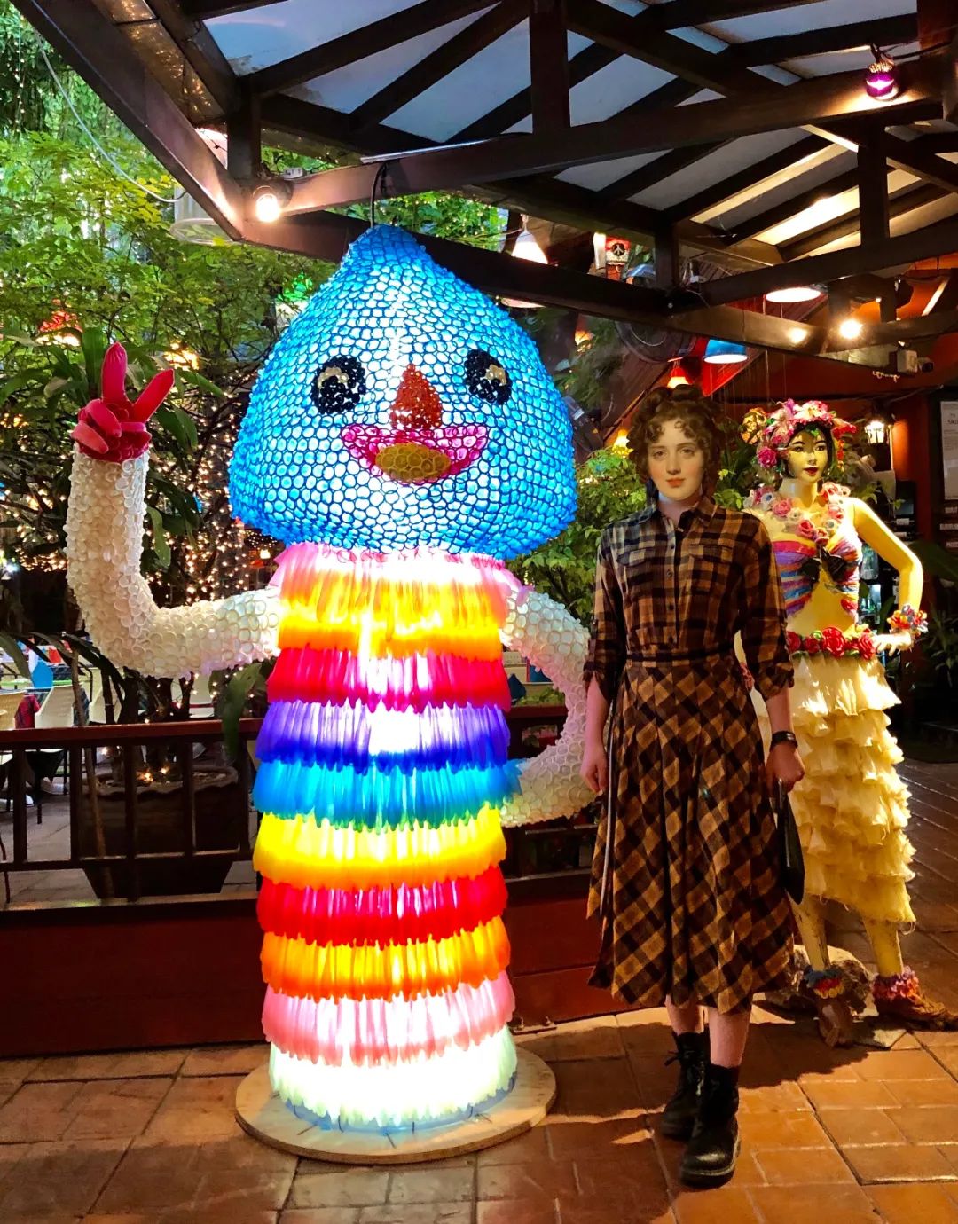 卷心菜与避孕套?如此清奇的搭配挑起了我的好奇心。尽管来到了泰国曼谷这样一个有性交易场所和人妖表演的地方,我一个独身女性也不方便夜探红灯区,而这样一家餐厅在某种程度上弥补了我的遗憾,让我从与众不同的角度窥探泰国性文化的一角。走进这家餐厅的大门时我还略带犹疑,除了店名中的Condom一词,这家坐落在泰国市中心幽静小巷中的餐厅乍看起来没什么出众之处。店员们友善地操着带口音的英文为我指引方向,走过几道门和曲折的回廊,这家餐厅逐渐向我展开了全貌。Cabbages & Condoms(C&C)是一家名副其实的避孕套主题餐厅,在它的边边角角处都能找到“惊喜”。最显眼的莫过于伫立在回廊两侧和餐厅各处的避孕套人形,这是用五颜六色的避孕套粘贴在塑胶模特身上做成的。我曾在一篇关于避孕套艺术的文章中使用过这些人形的照片,当时没能找到图片出处,哪知今天竟能与它的实物面面相觑,真是缘妙不可言。从圣诞老人到艾莎女王,可谓是传承经典,紧跟潮流,创意与精致手工的完美结合,隔壁小孩都被吓哭啦。