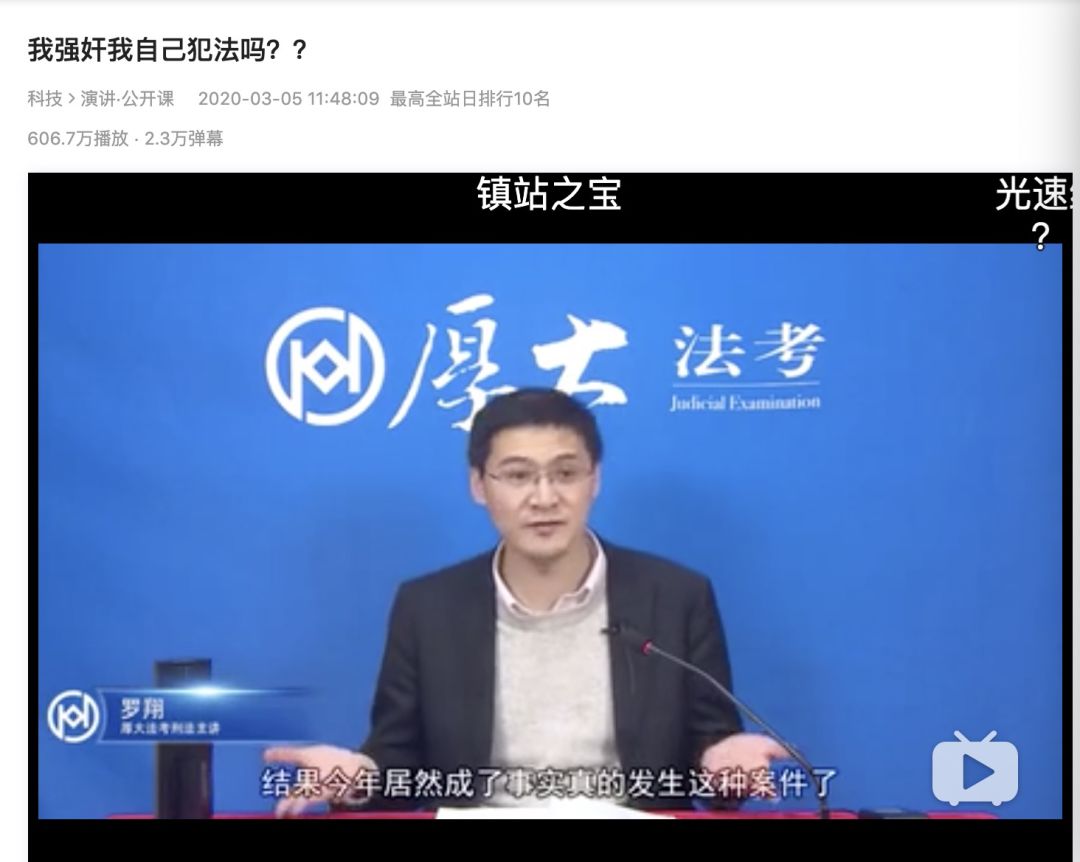 他,一个神奇的男人,一个让整个B站为之沸腾,微博为之狂欢的老师,罗翔。他在B站开账号三天,粉丝就突破了100万。同时,罗老师还活跃于在知名考研学习网站Pornhub上,看过罗老师视频的铁子手牵手可绕地球三圈。- 是他,就是他,他带着张三走来了 -