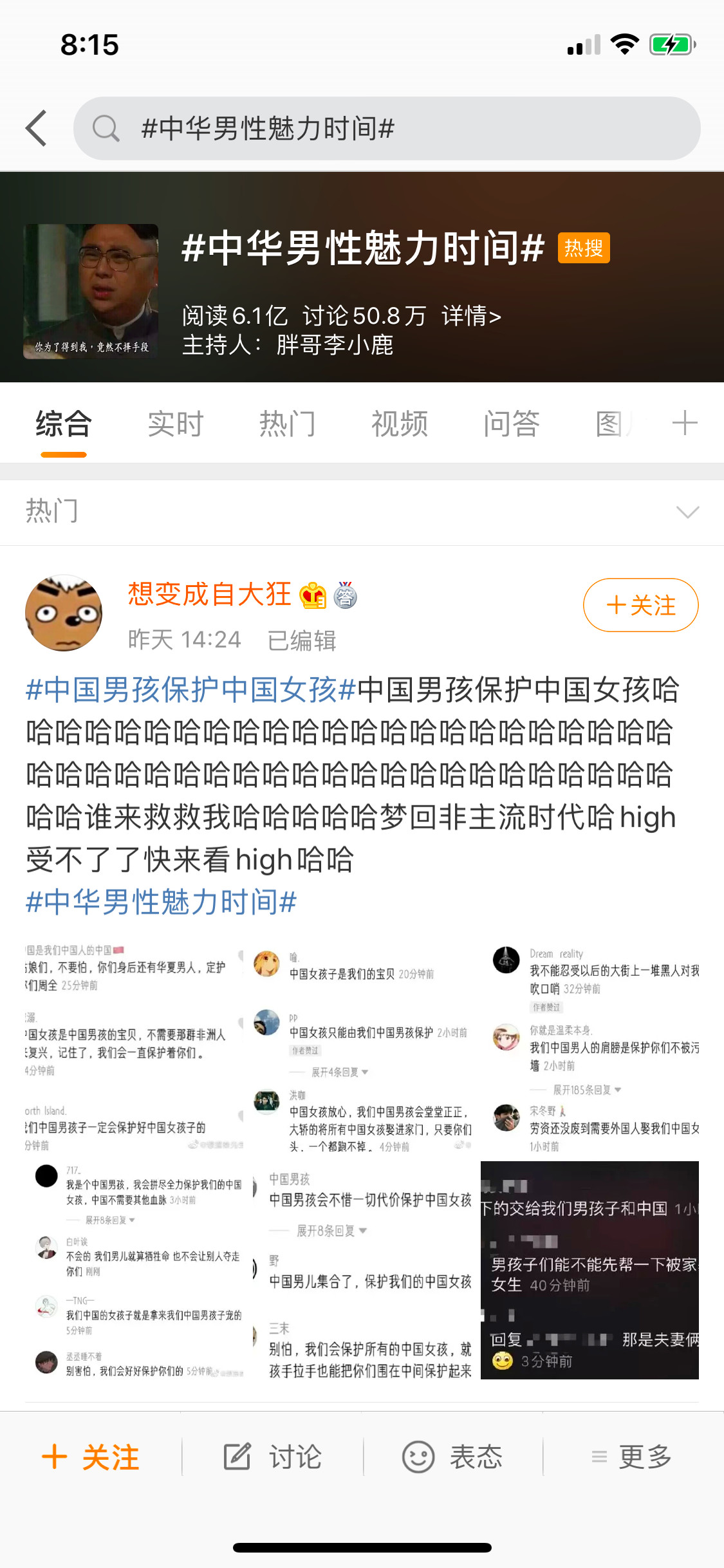 这两天#中华男性魅力时间#凭借其子话题“中国男孩保护中国女孩”再次占据微博话题高地。而“中国男孩保护中国女孩”这个话题的出现与其背后价值观一样都很迷。2月27号,司法部发布了一则《外国人永居管理条例》,并征求社会意见,一下子引爆了大众讨论。重点本应该是讨论这项条例的种种漏洞与不公,结果话题风向却奇怪地飘向了另一个方向——“女性资源”。
