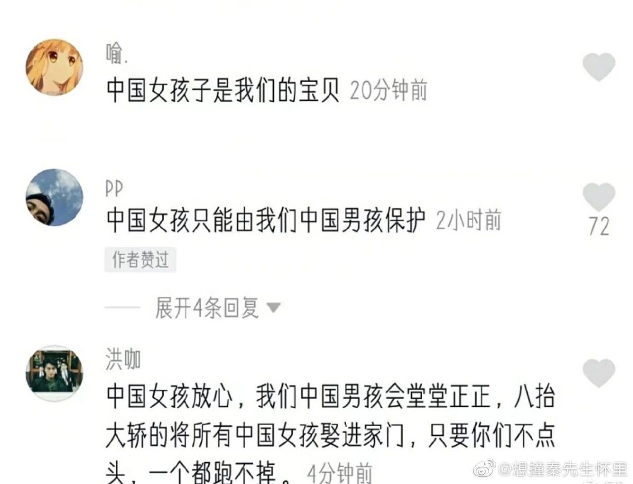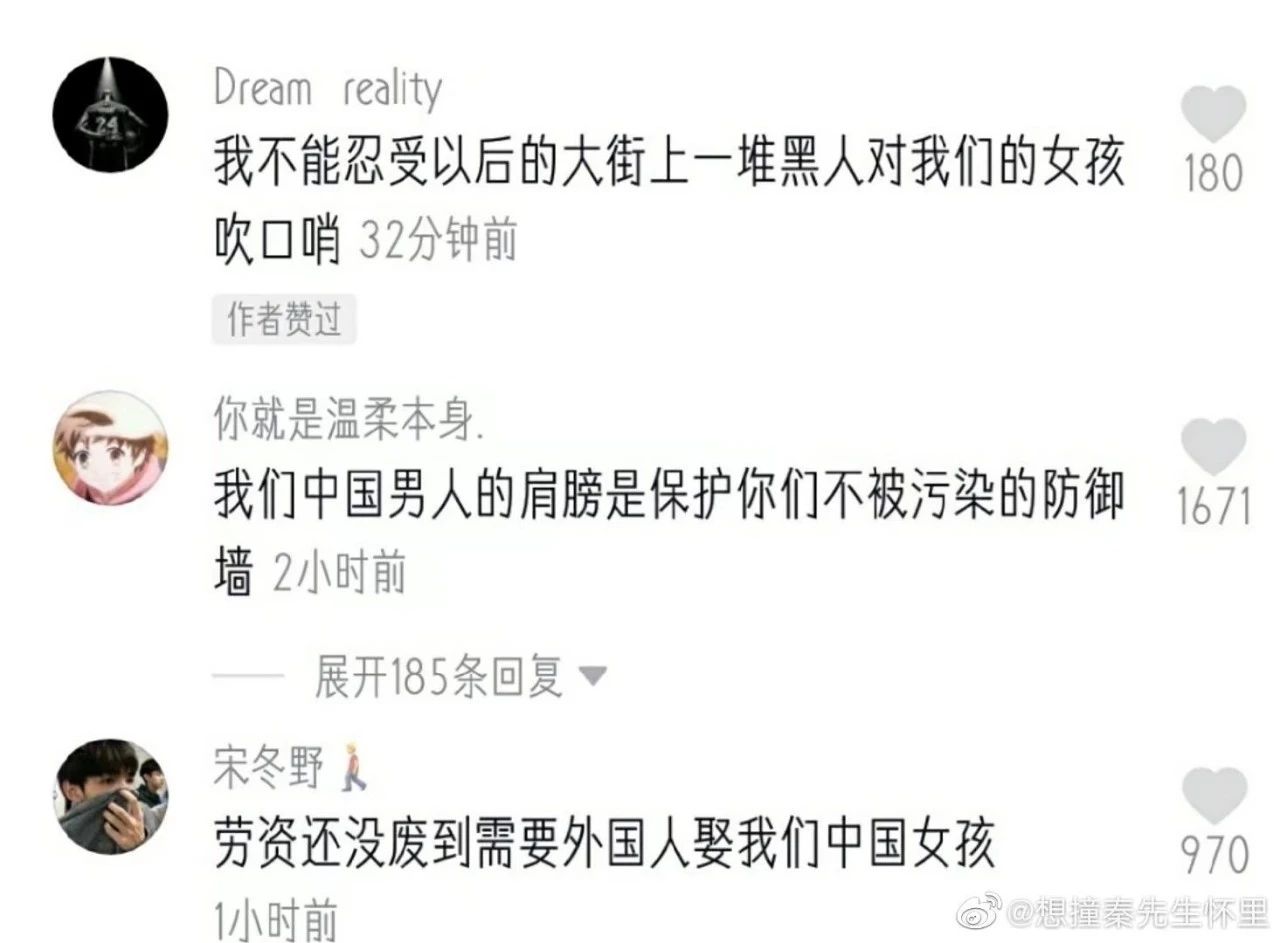 “中国男孩”们认为一旦通过这则条例,便会面临女性资源被“异族男性”争夺、强取的风险。于是一个个化身热血勇士,在网络上扛起了“保护中国女孩”的大旗。先来感受一波“抛头颅、洒热血”式的情话,一定要配上“中国男孩”特有的低音炮和忧虑气息,在“中国女孩”耳边轻轻说:按照这群魅力男性的高潮逻辑,情节走向应该是:“中国女孩”看到后眼眶泛泪,也高举‘守贞’大旗,发誓只嫁华夏二郎。”偏偏剧本递给了“观众”,情节走向一下子从小农社会偏差到了现代社会。