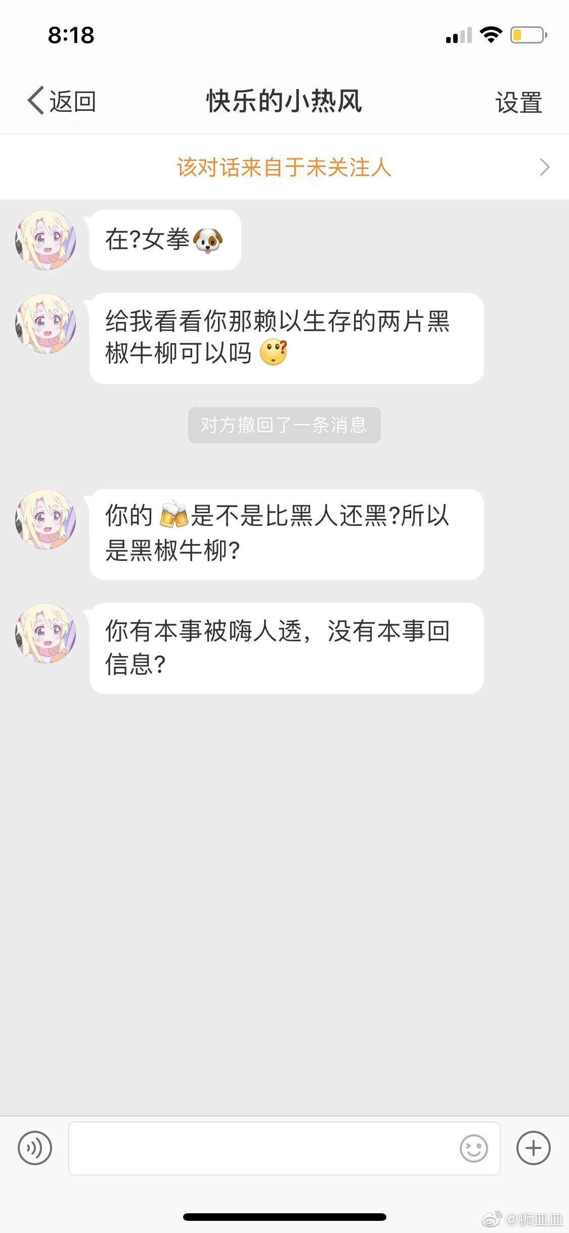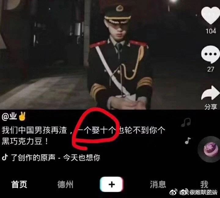 这种脑回路是怎么养成的?也许是被社会男权意识哺育出来的。在他们的下意识里,善恶公正是次于男权意识的,当出现问题时他们会优先选择保护自己的男权地位。换种说法,也是双标啊。没有分寸地开黄腔,可以说是“中华男性魅力”的一大特色。- 一位女生在微博上发了自己和黑人男友的合照后收到的私信 -
