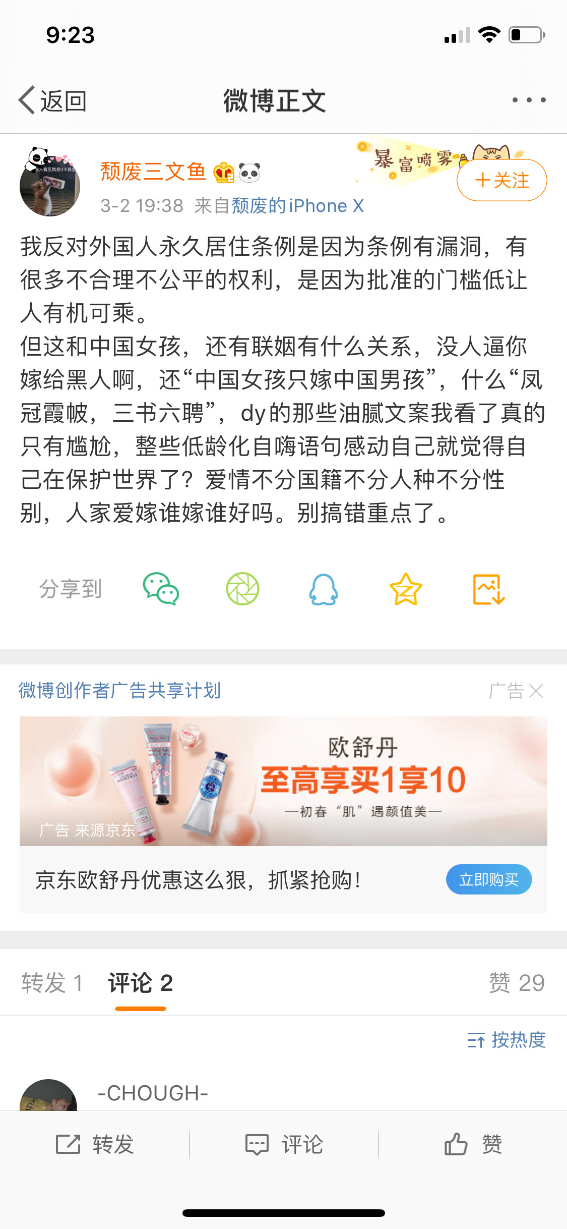 那好,桃子再来跟你掰扯掰扯。恕我直言,我没想到有人可以把物化女性和种族歧视说得如此大义凛然。一个人是属于另一个人的,这个人没有个人意识的吗?是可以买卖流通的物品吗?人与人之间从来不应该是从属关系,就算是母与子也只能相互独立、合理关爱,夫妻也最多是契约关系。都2020年了,还搞反对异族通婚,一边口口声声反对华裔歧视,一边自己搞着种族歧视,这真是“驰名双标”啊。