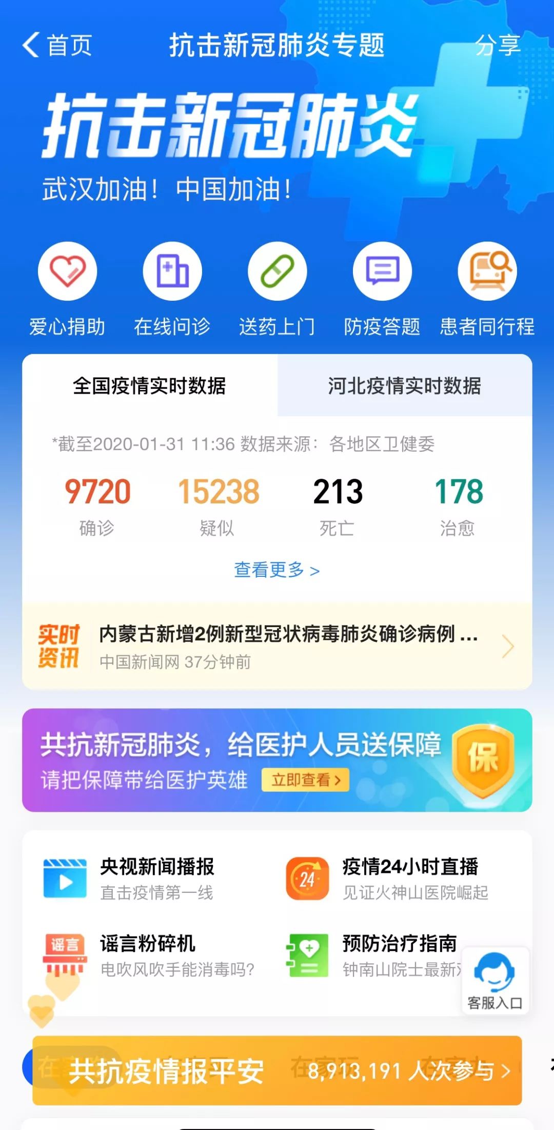 如果担心自己或者家人与确诊患者是否同行过,央视新闻联合搜狗搜索,共同推出“患者同程查询”,只要输入时间、班次和地区即可查询春运期间出行的各类公共交通工具上是否有确诊患者,以便主动配合相关管理机构进行信息申报,并辅助判断自身健康状况。打开支付宝抗击新冠肺炎专题,含有爱心捐助、在线问诊、送药上门、患者同行程,以及全国和你所在省份的疫情实时数据。更含在家买、在家吃、在家玩、在家办、在家看、在家学、多个栏目让你足不出户完成日常所需。据央视新闻,专家介绍,病毒通过快件传播的风险极低。我们要求邮政和快递企业严格落实对邮件、快件、运输车辆、生产作业场所的消毒、通风等措施,严格落实安全查验的制度,严禁收寄野生动物。因此大家不用担心,正常的快件不用拒收,收完快件请及时洗手。同时,专家提出,目前武汉的快递采取定点收寄、定点投递的模式,由快递员与用户电话联系,优先选择投递到智能快件箱,以减少人员间的接触。截至目前,武汉市寄递服务基本平稳,但快递小哥压力较大,呼吁减少进出武汉的非必需快递需求。据人民日报消息,武汉协和医院再次求助!最新消息,武汉协和医院物资即将全部用尽!恳请大家支援武汉!链接为武汉周边需要捐赠的医院名单更新