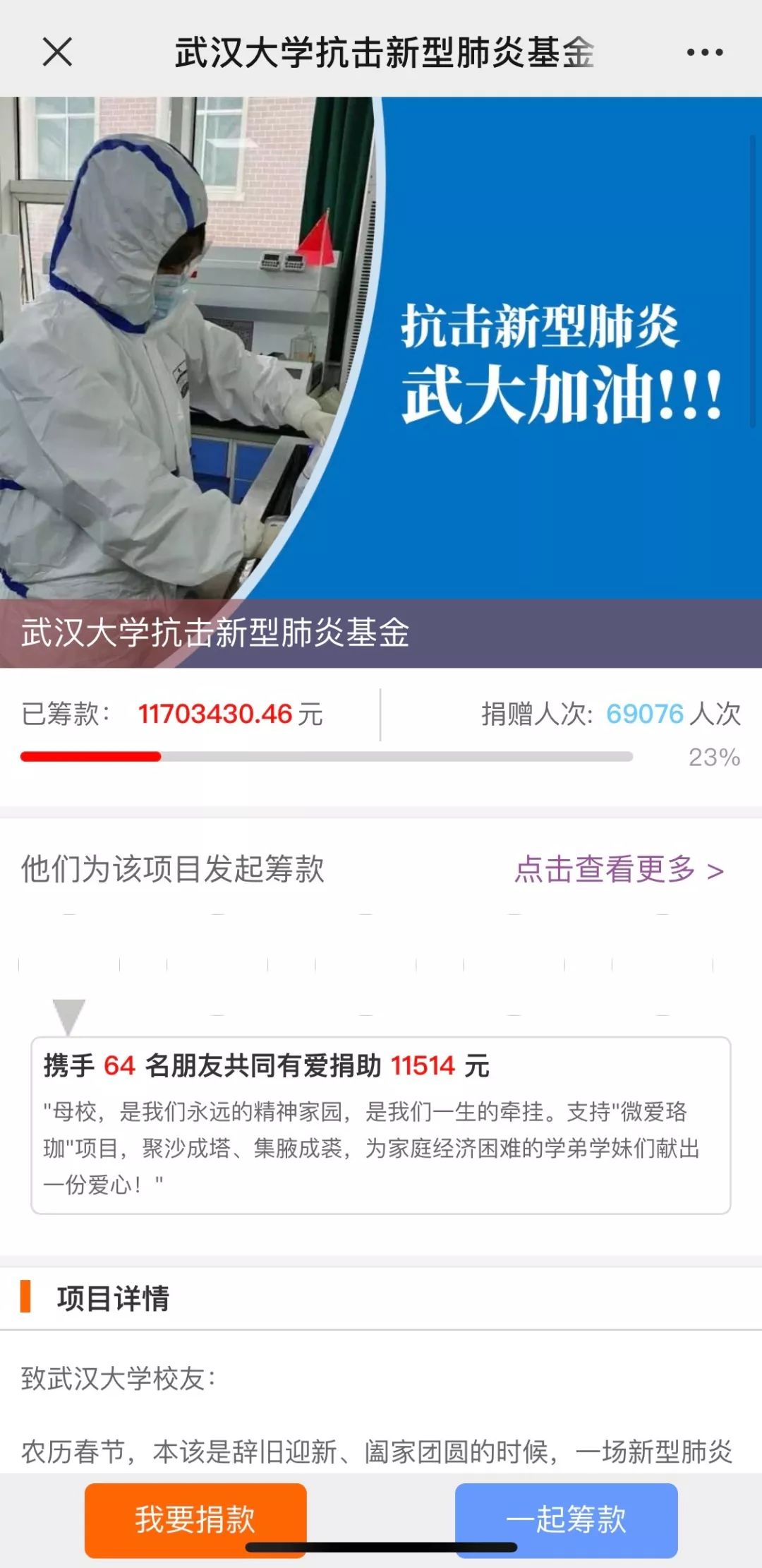 http://pms.whu.edu.cn/app/index.php?i=4&c=entry&id=48&do=detail&m=hx_zhongchou&wxref=mp.weixin.qq.com&from=timeline&isappinstalled=0#wechat_redirect桃子捐款截图及凭证(由于微信限制,当日单笔捐款不能超过2000,所以桃子分昨日和今日两批完成总计3200.66元捐款)。