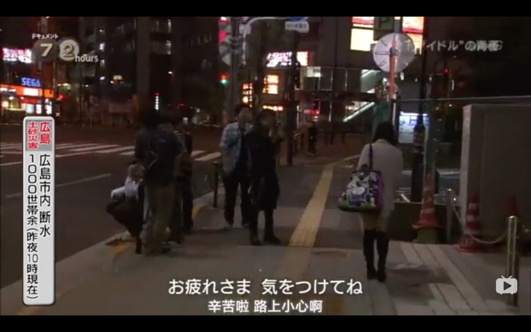 来看公演的很多是中年大叔,他们在下班和回家的间隙来到秋叶原,为支持的爱豆应援,这是一种解压的方式。“看到她们即便休息时间很少,也积极努力,自己也会充满干劲儿啊!”23:42分,少女偶像从剧场下班回家,一旁等待的粉丝没有簇拥而前,只是远远喊了一句:“回去要好好休息啊,一定要睡两小时以上。”他们每天都会在这里目送女孩子们下班。- 十二点后,剧场结束公演,粉丝们在外面等着小偶像 -