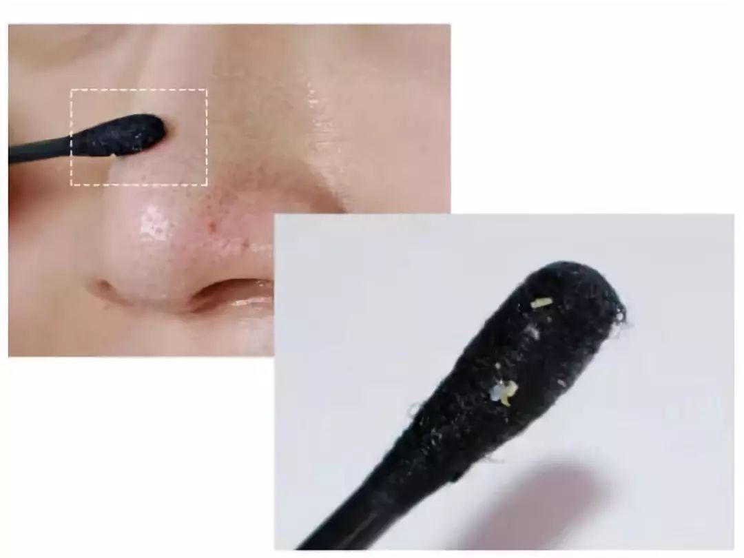 待起泡之后等上5~8分钟,就可以用清水冲洗掉啦,再搭配粉刺针或者棉棒,粉刺黑头很容易被刮出来了!
