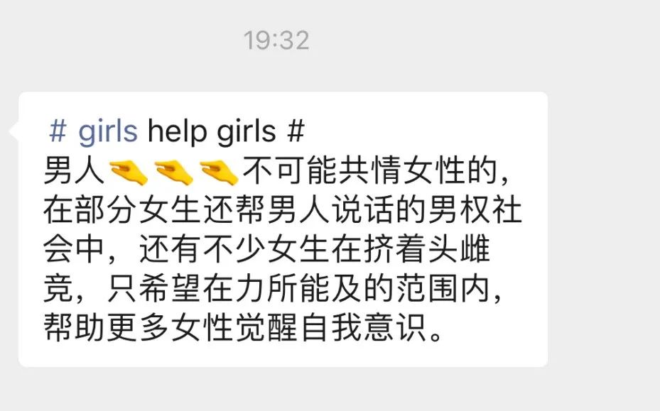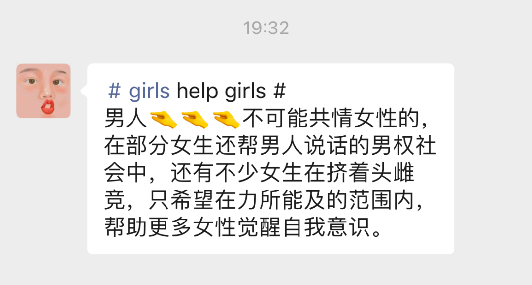 其实我不是很想说“girls help girls”,因为我知道自己也并不能真的帮到你们,好多时候我连自己都不能开解。但是,我仍旧相信姑娘们团结起来的力量,很多时候我们很难去改变人们对某件事情根深蒂固的想法,我们能做的,就是共情,就是永远不要再次伤害受害者。
