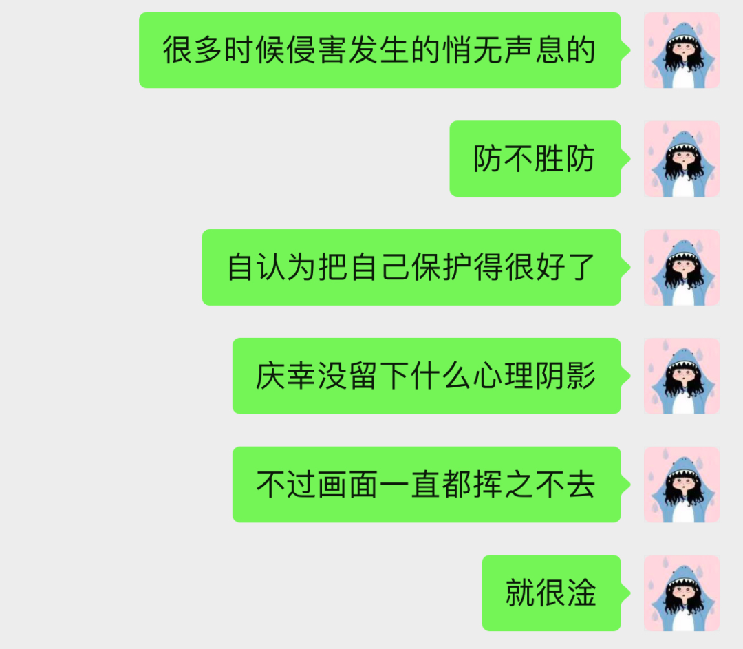 也许女孩们的第一反应就是心理上对自己的攻击,她们可能察觉不到,但是她们下意识觉得自己不干净,从而背负沉重的道德压力。有些女孩会担惊受怕,对生活中的一些事都更敏感;有些女孩会觉得自己“不干净”,从而没办法好好爱护自己。她们有多善良,可能就会受到相应程度的心理创伤。