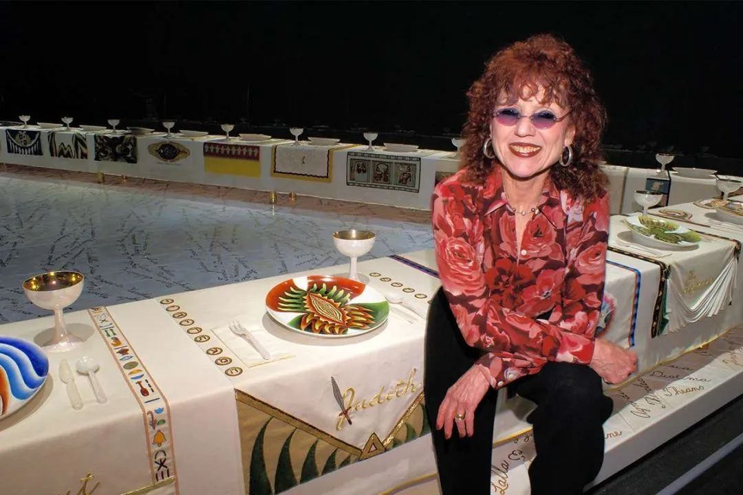 其中《晚宴》是1970年代女权艺术的重要标志,也是20世纪艺术届的里程碑。《晚宴》模拟了一场盛大的的宴会,39个席位以等边三角形排列开来。每个席位都纪念了一位历史的重要女性,而三角形代表了男女平等。每个座位上都放置了餐具,和代表她们的旗帜,餐盘上雕刻蝴蝶或是花朵的图案,隐喻着女性生殖器。