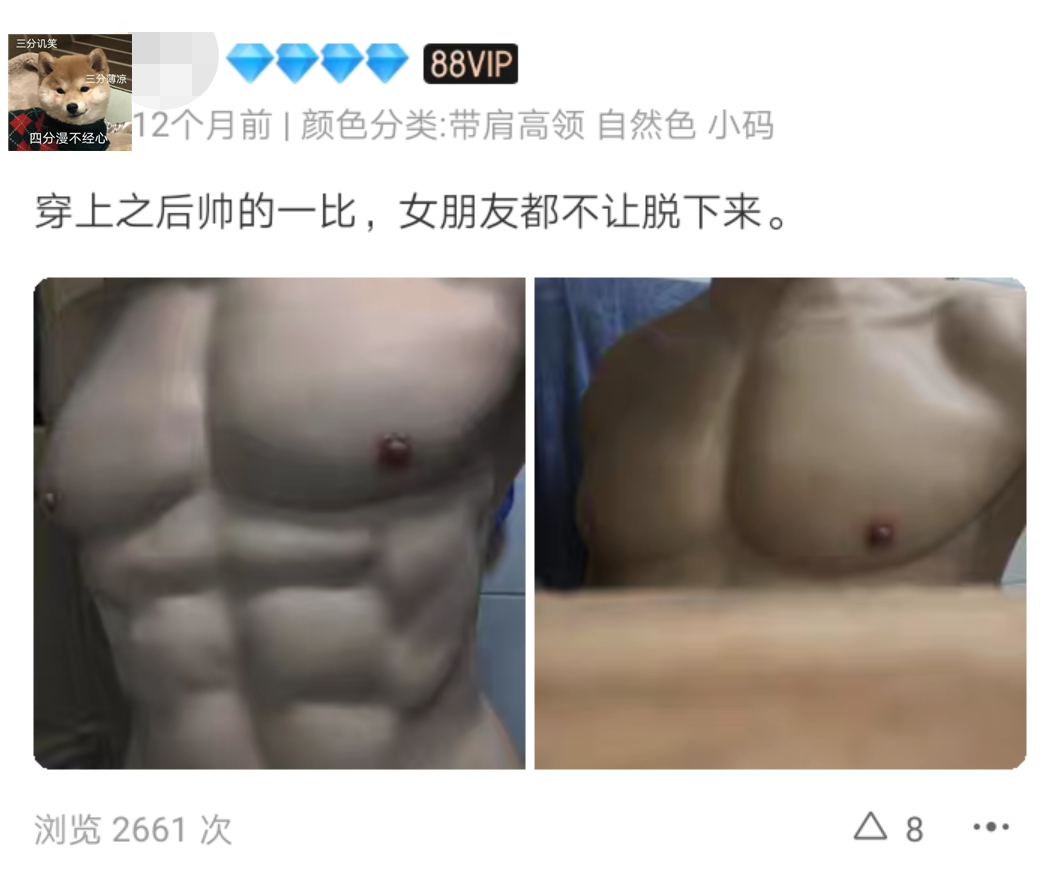这些都让部分对腹肌过于有执念的男性更加不平衡了:别人都有,我也得有。于是,部分坚持不了健身的男性就开始探索买肌肉衣等系列让自己看上去有肌肉的方法。