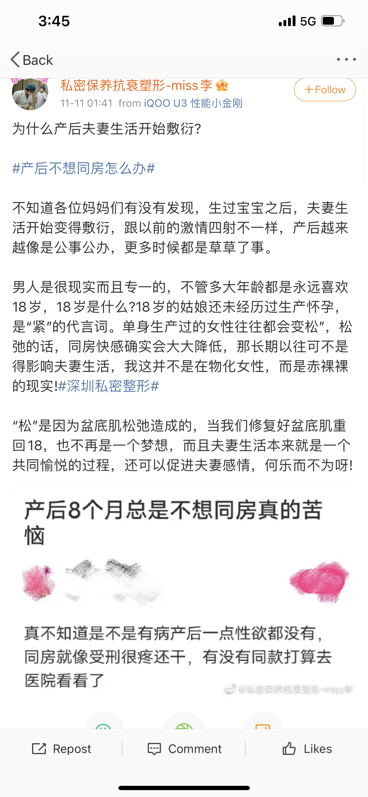 其实,在很多推荐私密整形项目的账号里,他们使用的也是这些非常赤裸的词语:“18岁是‘紧’的代言词”,“男人不管多大年龄都喜欢18岁”等等。看到这里,大家应该明白了,私密整形,本质上就是为了取悦男人。
