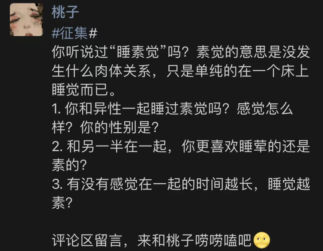看了这些,我想说,只是想找个人抱抱睡觉而已啊!为什么要搞那么多花里胡哨的!于是,桃子在朋友圈做了小范围的征集,发现现在睡过素觉的男女,还真的不少。@天生反派:我睡过的素觉不止十个了,都是些不来电的,或者是宿醉的异性,我是男的,我时刻提醒自己不做出格的事情。感觉大同小异,毕竟每个人身上的体香各不相同。
