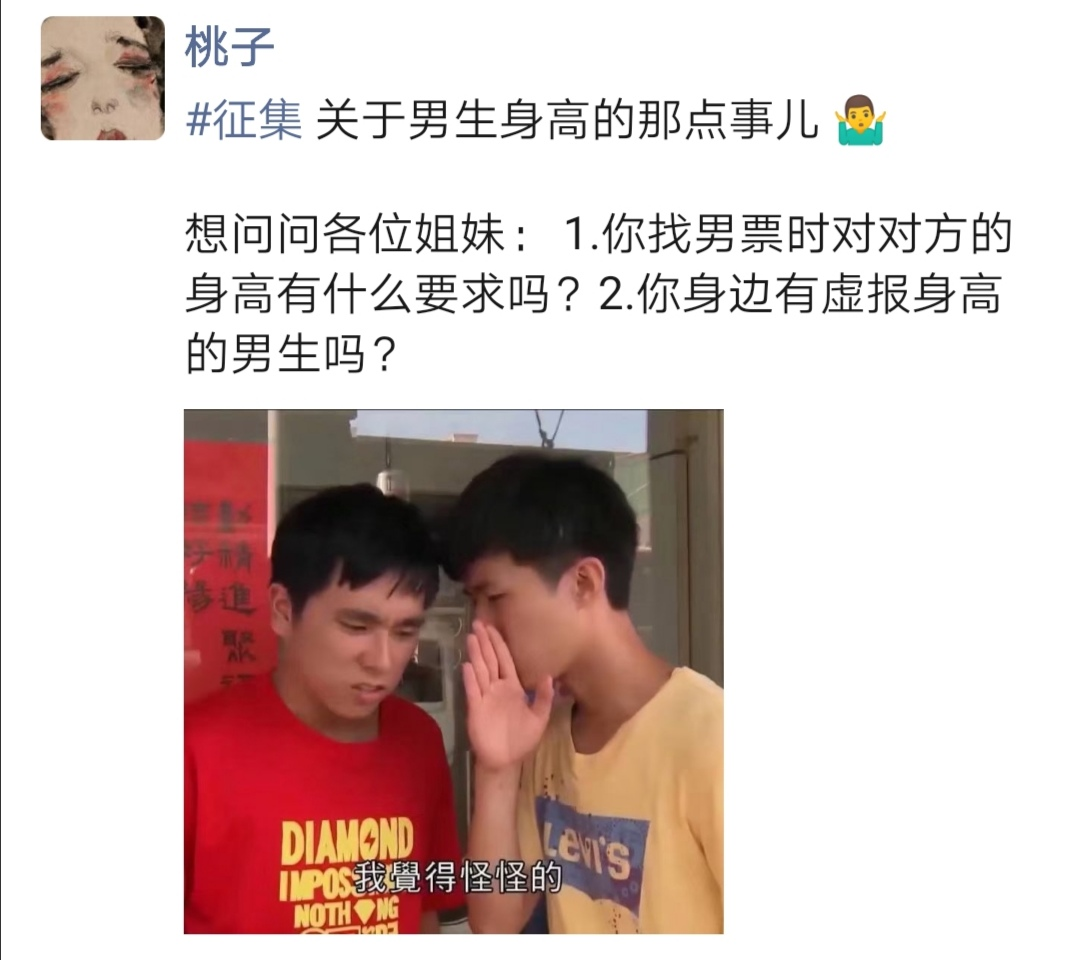 所有男生!你们会虚报身高吗?你们觉得个子高低对找对象有没有影响呢?欢迎来到本期桃子爱body栏目,本期为男生身高专场,桃子带大家走近男生身高背后的秘密。为什么有这档节目呢?还得从前两天桃子刷到个视频说起。视频的标题为《街头测试:当路人谎报身高被当场拆穿,原来男生都这么在意身高!》,视频里记者找到一些路过的男生采访,先问他们有多高,问过之后再提出想找尺子当场测量身高。实际测量结果让人大吃一惊。如实说身高的男生实在是寥寥无几。有的受访者更是强行挽尊,在测量时偷偷垫脚,或者找理由说身高早晚会不一样,或者怀疑记者的尺子有问题。如中国女生苦体重羞耻久矣,中国男生,则苦身高歧视久矣。男生们大多对自己的身高十分在意,尤其是在发展亲密关系时。