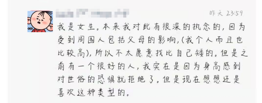 ?♂️小C:我这个身高找对象其实挺加分的。之前和几个交友软件上认识的女生面基,她们都因为身高对我第一印象很好。之前有一朋友玩交友软件,因为身高被发了N次好人牌。后来好不容易打动了一个女生,见面之后女生说他没有一米七不行(他号称170,实际165),也掰了。
