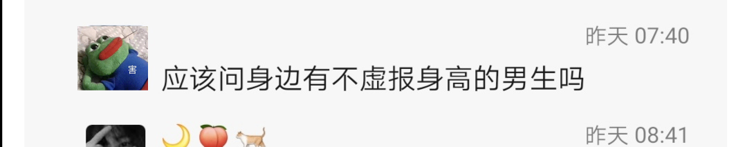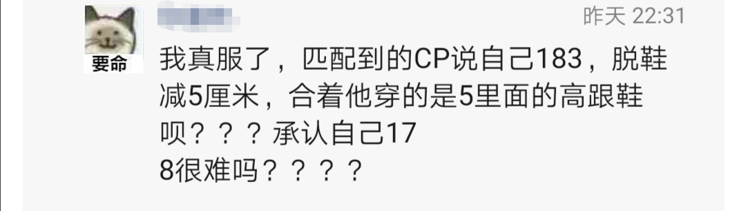 ?♂️小C:啊这…其实是因为最近在交友软件聊天,我写自己180有妹子觉得我是虚报,上来就问我真的有180吗,怀疑我只有178…加上以前体测量过一次确实有184(哈哈,穿鞋量的