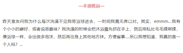 桃子就曾收到过一个投稿,说是自己有“用私处的毛搓泡泡”的习惯,想知道大家会不会觉得很奇怪。