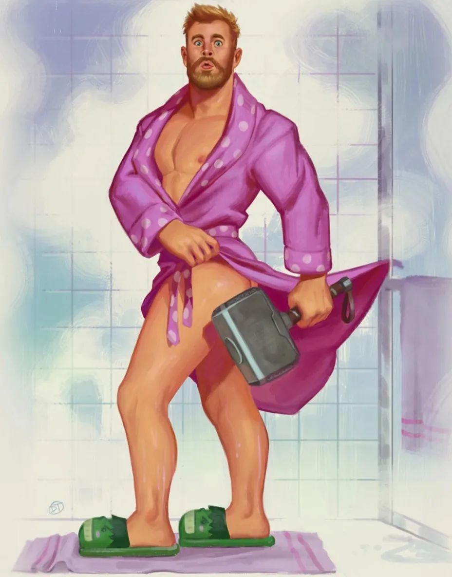 于是,漫威、DC里的各种超级英雄就成了他最好的原始素材,他将pin-up girl的风格男性化,让我们也能一睹超级英雄们的娇羞时刻。