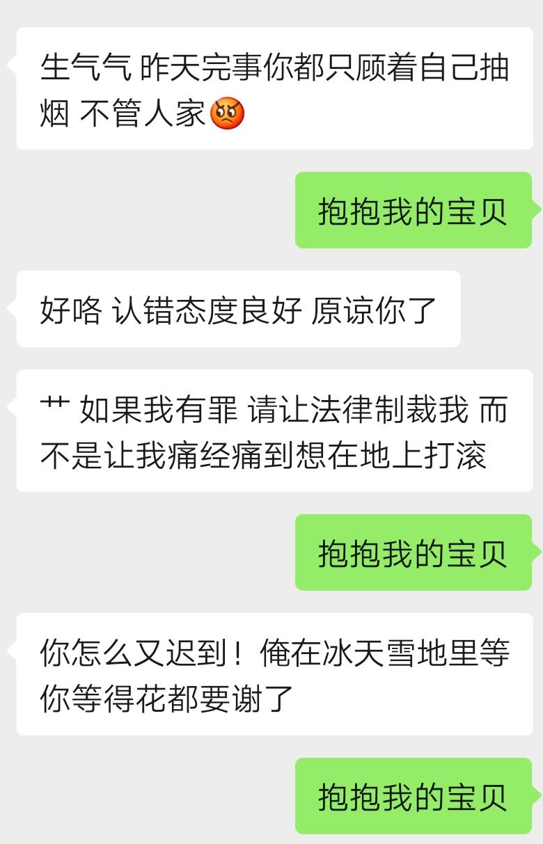 场景二:我女票因为我事后光顾着抽烟去了忽略了她跟我闹别扭,我一直男也不知道怎么回好,就回了个“抱抱我的宝贝”。妹想到,这句话还挺管用!从此,我就将这句话奉为金科玉律,贯彻落实到床上床下了。