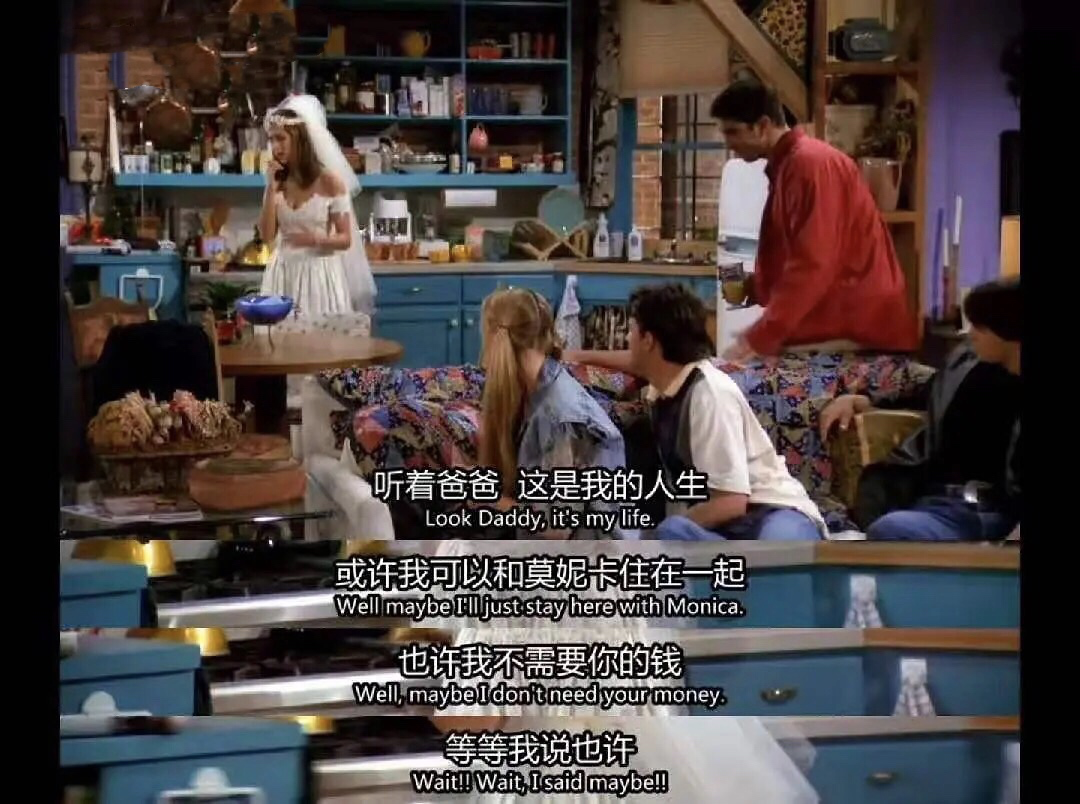 在整部《老友记》的一开始,瑞秋就穿着婚纱出现在咖啡馆里。她和主角莫妮卡是高中同学,是彼此唯一信赖的朋友。瑞秋的未婚夫是个牙医,这算得上是相当体面的工作了,未婚夫几乎得到了瑞秋家里人的喜欢,但瑞秋不爱他。