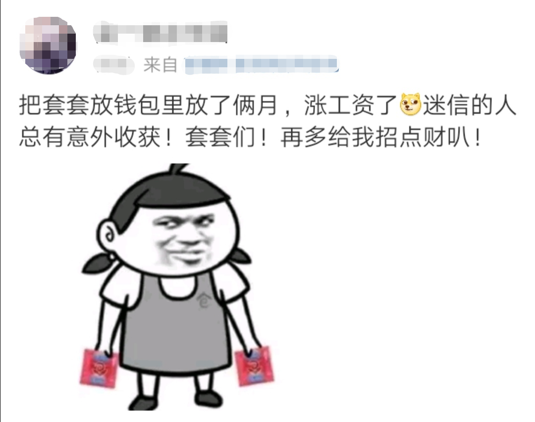 而关于钱包里放套套招财的玄学来源,多有两种说法:第一种是说套套放在钱包里,可以把钱套住,不让钱消失。第二种说法是说套套吸“金”(谐音梗扣钱)。