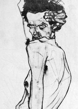 - 席勒,《用两肘休息的跪着的女孩》,1917 -- 席勒,《盘腿且头斜倚的裸体女人》,1918 -席勒是个有故事的男同学,他的故事感不仅体现在他对性的大量多姿描绘中,还表露在他的自画像中。与宫廷画师画人自带PS功能不同的是,席勒的自画像和他本人的外表完全不同,或狰狞或病态或锋利,我无法确切了那是他是内心深处的自负还是自恋又或是自卑,但这种不定态,似乎让我看到了无数个曾深夜苦苦寻找自己的旅人。- 席勒,Photo : Imagno / Getty Images -