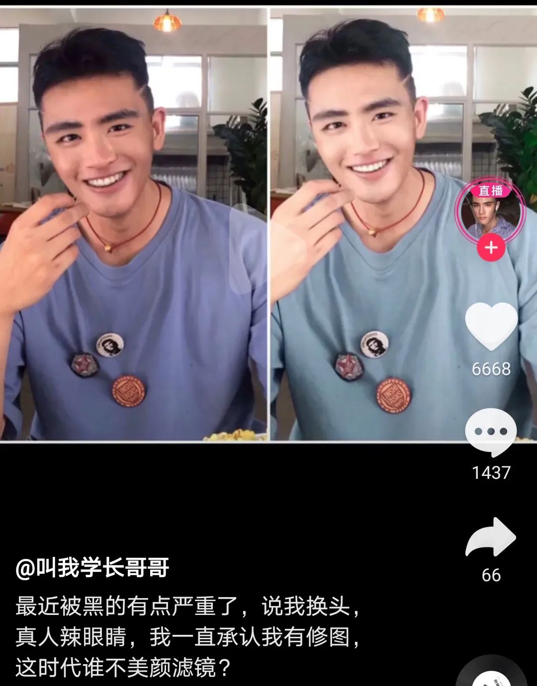 乍一看确实只美了颜调亮了肤色,但仔细一看,啊喂!左边那张分明已经进行过精细化调整了。最后在直播中,他露出真容。直播里的他和小视频里的他,虽然不能说是一模一样,但可以说是毫无关系了。