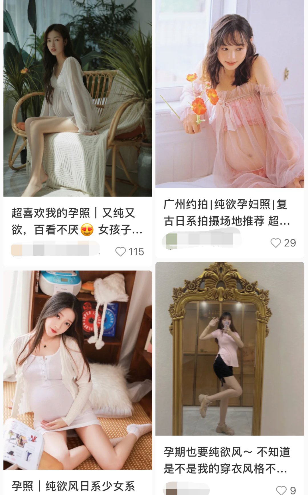 号称绝绝子的“纯欲关节炎”便是其中一种。有网友把腮红扫在手指头关节处、锁骨处、膝盖处,还声称在这些地方打上腮红,立刻就能达到纯欲感的巅峰,狠狠把男人拿下。讲真,能get到的知道这是为了追求纯欲感,不能get到的,只会以为是耳朵生冻疮了还没好吧…万物皆可纯欲的年代,在口罩上扫腮红也成了不足为奇的操作了。口罩是用来防护的,涂上几层腮红,这口罩的功能怕是也大打折扣了。真想戴口罩戴出美感,咱还是买厂家生产的带颜色或图案的口罩,DIY算咋回事啊?大概是有些网友的口红不太好使,于是她们便想出了用睫毛夹夹嘴巴,用饮料瓶盖吸嘴巴,用变态辣火锅料抹嘴巴的办法让嘴唇显得更丰满可爱。这么操作完,嘴唇是暂时变嘟了,但绝对不可能长久,而且肯定是很伤嘴唇的啊!当然,最让桃子迷惑的还是纯欲孕妇照。这类照片在某书上一搜一大把,尺度还一个比一个大。孕期写真为啥要这么拍?也是让人难以理解了。其实纯欲一开始并没有这么多花里胡哨的表现形式。不是拿着腮红随便扫扫,肩膀抖抖屁股扭扭就是纯欲。被公认为纯欲鼻祖的是徐若瑄、崔雪莉等。观察她们的照片可以看出来,她们的清纯感是不加修饰的,而欲欲的感觉也并非通过招摇的动作和暴露的穿着来实现。她们只在那一站立,不需要刻意卖弄,也不需要做出什么幼态化的举止,天生的单纯和媚气便会由内而外的散发。这种既像天使又像魔鬼的撩人感惹得人心痒痒。而我们一开始欣赏纯欲风,欣赏的也许就是这种反差感。早先时候,博主们出纯欲风妆容尚还看得过去,毕竟只是一种风格嘛,好看就完事了,纯不纯欲不欲的也不那么要紧。可现在大家学着学着就变味了。首先,是一部分人打着纯欲的tag往“纯”的方向用力过猛。具体表现为腮红的滥用,穿着的幼态化,眼神的无辜可怜化。用这三种要素营造脆弱感,可以说很清纯,但绝非纯欲。当纯欲风向幼态化过分倾斜,甚至还有儿童主播走纯欲风,其发展是否会和“恋童”扯上关系?这些未知的后果是值得我们思考的。之后,是一部分过分往“欲”的方向过分倾斜。具体表现为穿着的暴露和肢体语言的魅惑。还有一部分人彻底不清醒了,打着“纯欲”的旗号光明正大地搞黄色。- B站《<尊享版90秒>这就是你们想看的纯欲天花板吗?》 -