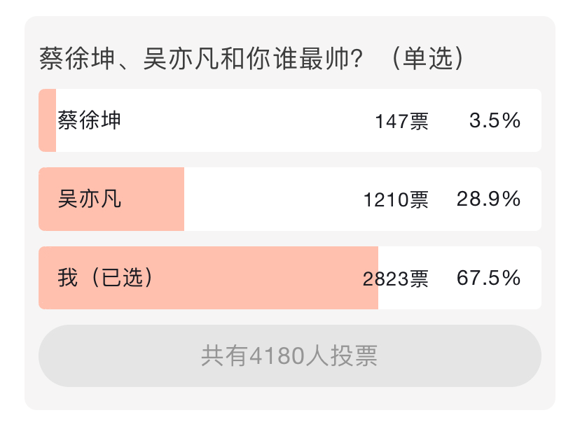 - 虎扑某投票结果。绝大多数人认为自己比吴亦凡和蔡徐坤帅 -
